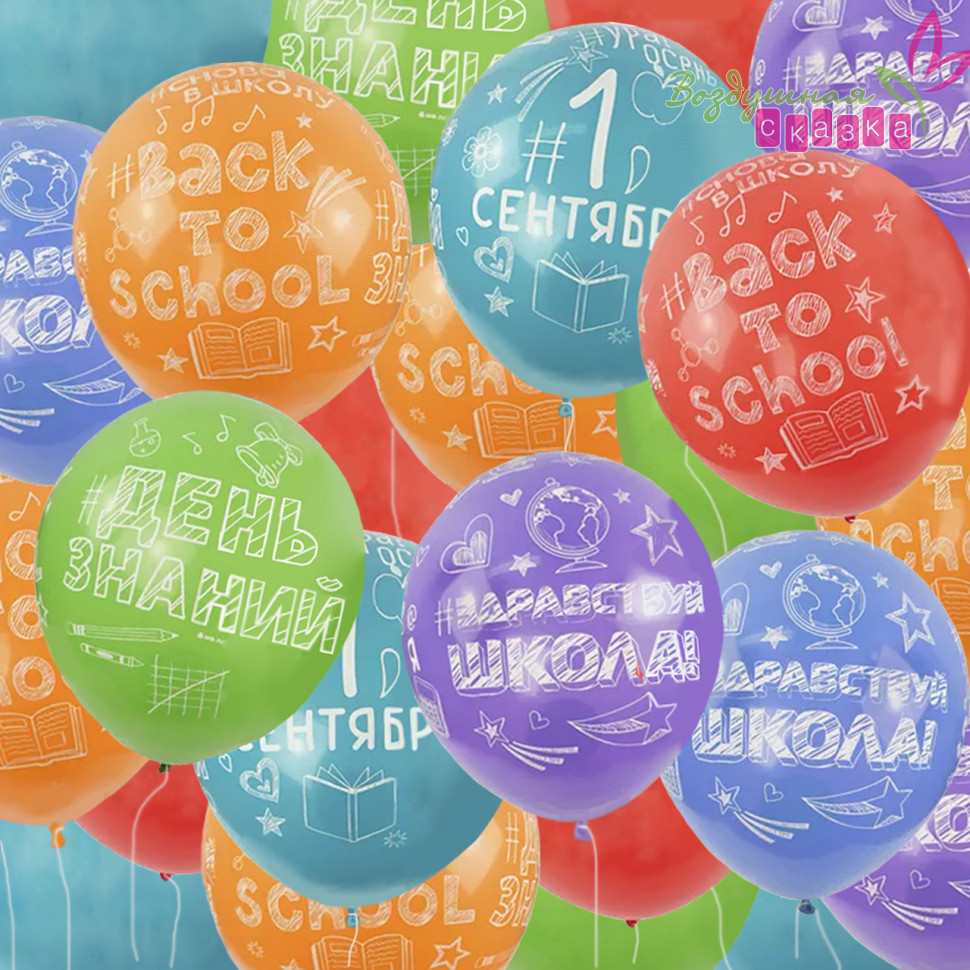 Латексные яркие воздушные шары на 1 сентября . ЗДРАВСТВУЙ, ШКОЛА! 12"/30СМ 5 Сторонний рисунок . Тематика оформления школьная пора 1 сентября .
