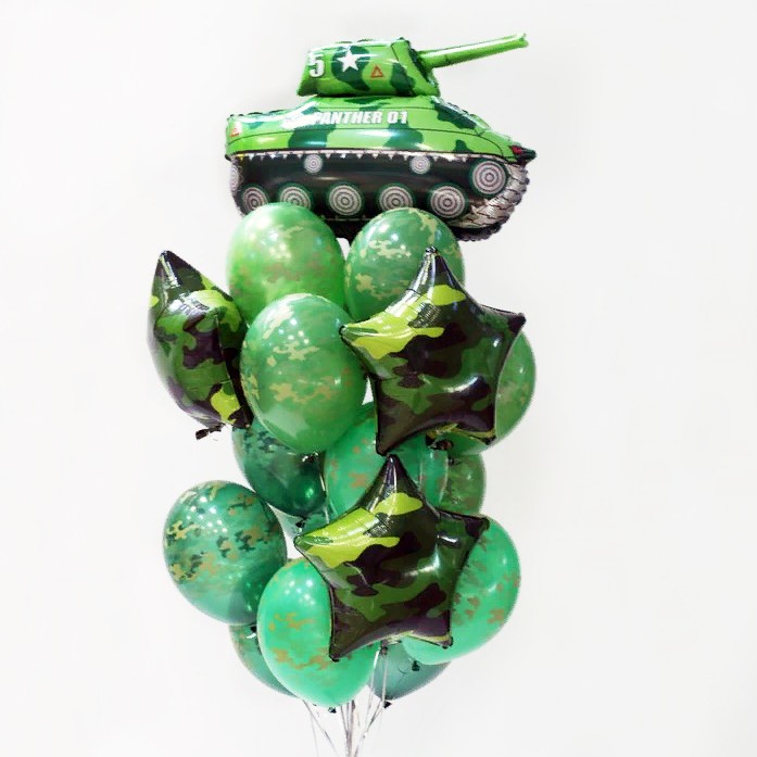 Готовый букет на 23 февраля камуфляжный с гелием15 Латексных шаров - Цвет хаки (Камуфляж)3 Звезды - Камуфляжная красивая звезда 18"/46СМ1 Танк (32''/81 См)