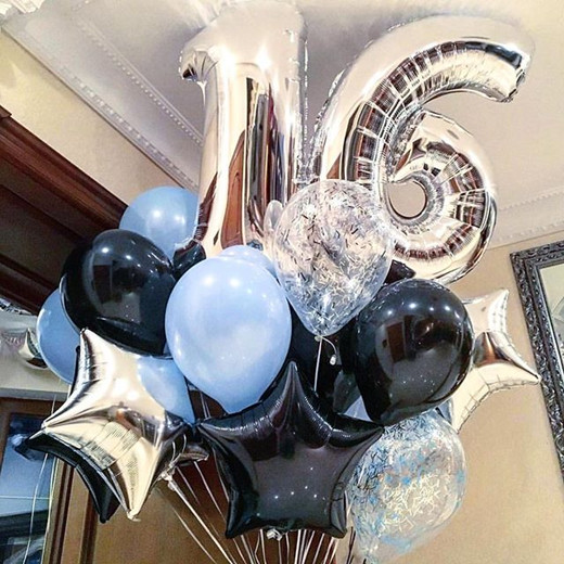 Готовый букет на торжество включает себя : 10 латексных гелиевых шариков 5 чёрных и 5 голубых размер шаров 35 см.