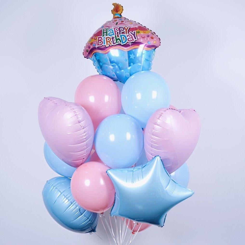 Композиция формат Букет из шаров нежный подарок на день рождения.1 фольгированная фигура на день рождения (Возможно менять верхушку по вашему желанию ) 500 руб.3 сердца из фольги – 900 руб.1 звезда из фольги 300 руб10 шаров без рисунка – Нежного цвета розовый и голубой оттенок – 850 руб.