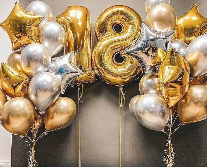 Два букетного фонтана по 12 шариков с гелием. Центр украшения две большие цифры из фольги.