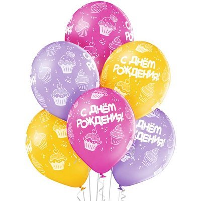 Тематические шары с шелкографическим рисунком С Днём Рождения. Кексы. Натуральный качественный латексный материал шаров пастель . Ассорти палитра шаров ярких цветов. . Размер шаров с гелием в надуве - 14 дюймов (36см).