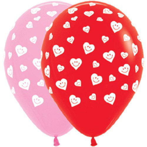 Шар (12''/30 см) Сердечки-смайлики, Розовый (009) / Красный (015), Ассорти, пастель, 5 ст, 1 шт.