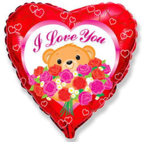 Шар (18''/46 см) Сердце, Медведь с розами, Красный