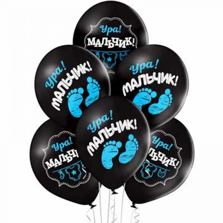 Выписка из Роддома и поздравление счастливого отца с помощью воздушных шариков композиция из латексных шаров «Ура, Мальчик, Черно-Голубой цвет »Размер 14"/36СМ